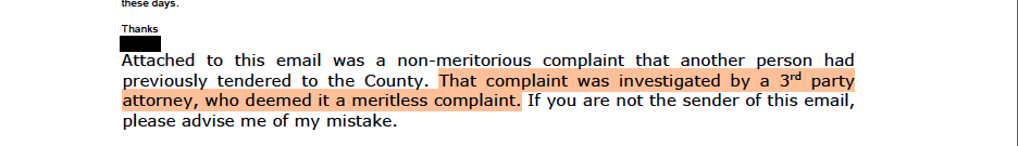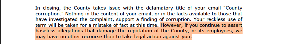 The letter reveals the county's strategy: use the inept and ethically challenged Haggard investigation as a shield. Claim it "found nothing" (false - it found "not enough evidence," which is different). Threaten legal action against anyone who continues to question the approved narrative.