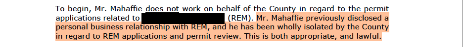 Personius claims Mahaffie "previously disclosed a personal business relationship with REM, and he has been wholly isolated by the County regarding REM applications."