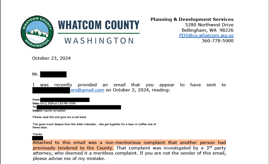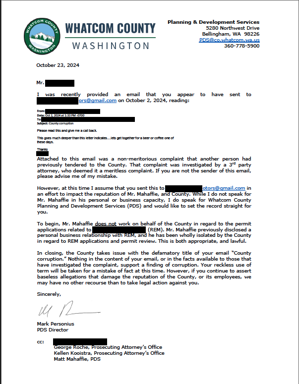 In October 2024, Whatcom County Planning Director Mark Personius sent a threatening letter to a citizen who had shared my corruption complaint with a local business owner. The letter is remarkable not for what it threatens, but for what it accidentally reveals: that county officials know exactly what they're covering up.