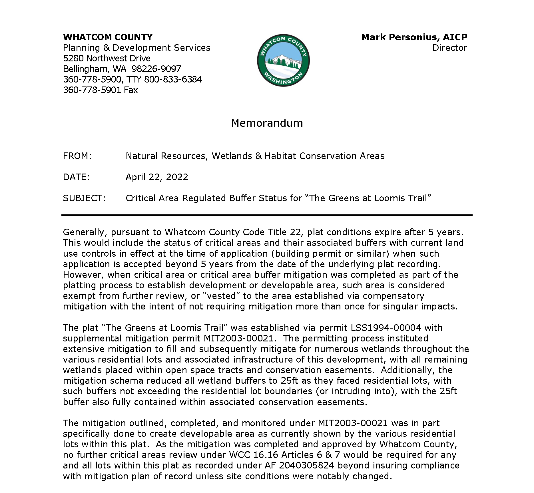 4. The Content: The memo states that wetlands in The Greens at Loomis Trail subdivision WERE mitigated in 2002-2003 under permit MIT2003-00021, and therefore "no further critical areas review" is required. That's pretty convenient.