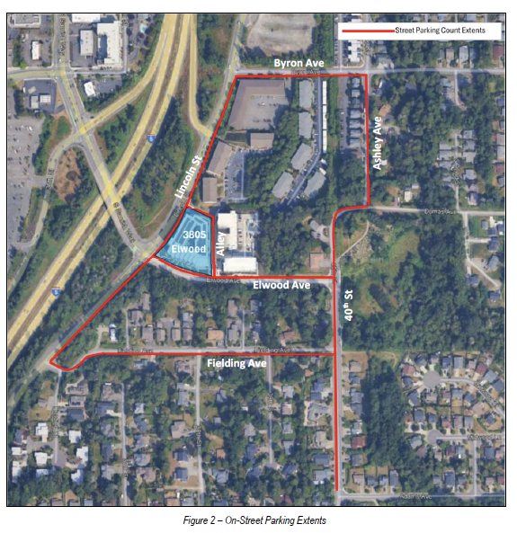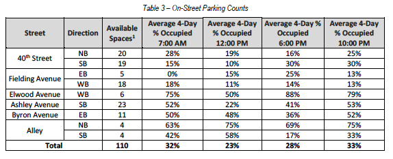 This parking "study" is looking at a complex that has OVER 200 parking spots in a garage. Yet the owner was FORCED BY THE CITY to pay TENS OF THOUSANDS OF DOLLARS to have a CERTIFIED PARKING CONSULTING COMPANY register parking "availablility" over a set amount of time. Notice that the company was looking at available parking on streets in neighborhoods 1/2 mile away!
